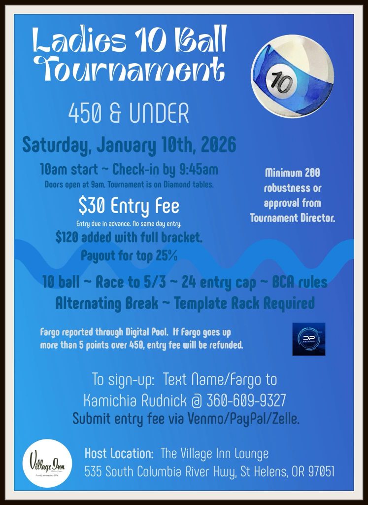 Welcome to Columbia Cue Club. This is for distributing information of all kinds pertinent to cue sport activities in Columbia County Oregon. Let us know if you would like to contribute or just keep informed.